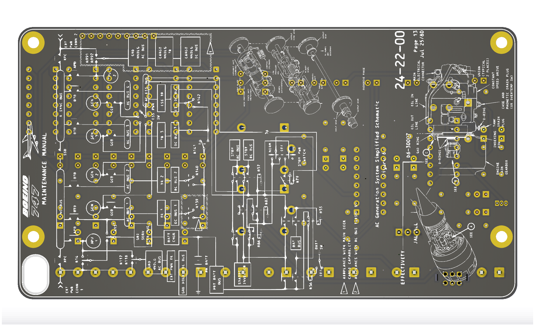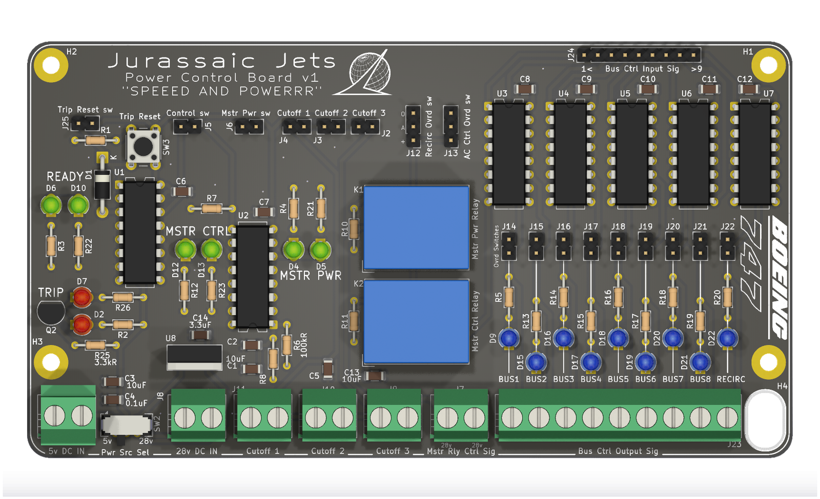 The boards have a variety of useful features that'll be a big upgrade to our current setup. The biggest improvement is the ability to override bus states. You can see lots of header pins on the board which will connect to switches on the front panel of the rack. These allow you to override the sim state and force busses on or off. It also has lots of LEDs to actually indicate what is going on, instead of the guessing method we currently use. You'll notice some doubled up LEDs, that's so you can replace one of them with a pin header and wire up to remote LEDs on the front panel. It's also capable of running on either 5v or 28v DC, with an onboard voltage regulator. The two big blue boxes in the middle are the master control relays, one which sends control power to all the relays, and the other which turns on the master power relays. The last feature worth highlighting is the cutoff loop. This can optionally be run to anywhere in the cockpit, and if the loop is broken it will trip the master relays. This lets us put a kill switch or have additional external checks that need to be happy in order for us to send power to the plane.