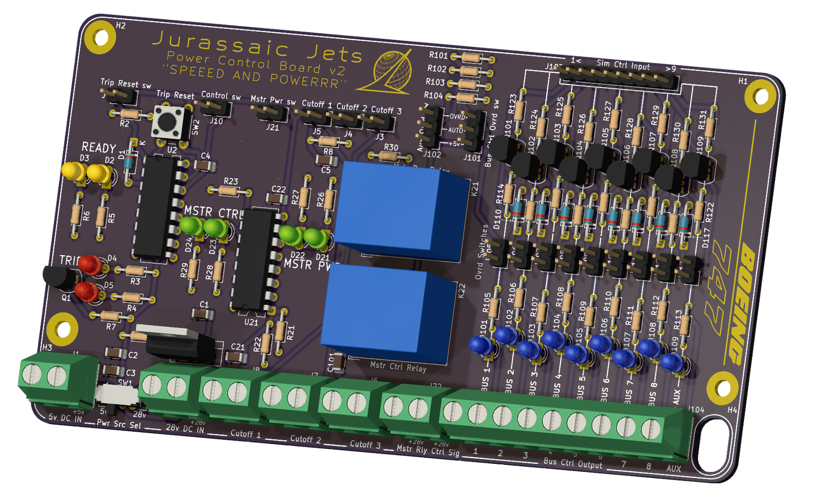 v2 of the power control board has been completed! The boards have been ordered and should arrive in a week or two. This version ended up doing a lot to refine the v1 design, and had some core architecture changes. The big difference is that this time I swapped the L293 chip for individual transistors (BJTs because why not). Along with that came some supporting components to correctly drive the BJTs, as well as diodes to prevent the reverse biasing which has become my nemesis on this project. In addition to that I added a time delay feature on the cutoff circuit to provide ~200ms of debounce and avoid erroneous trips. I added even more pull-down resistors to keep things safe, as well as removed a few optional components which I determined weren't necesesary. And of course the biggest change, a new silkscreen graphic on the back! You'll have to wait until the boards arrive to see that. I also wanted to test out doing the front graphics as ground traces instead of silkscreen, because it will be shiny (although I didn't pay the extra for gold plating). So in all theres not many functional changes but lots of things to make the board more robust. Now time to take a break from PCB design for a while and work on some other unrelated projects.
